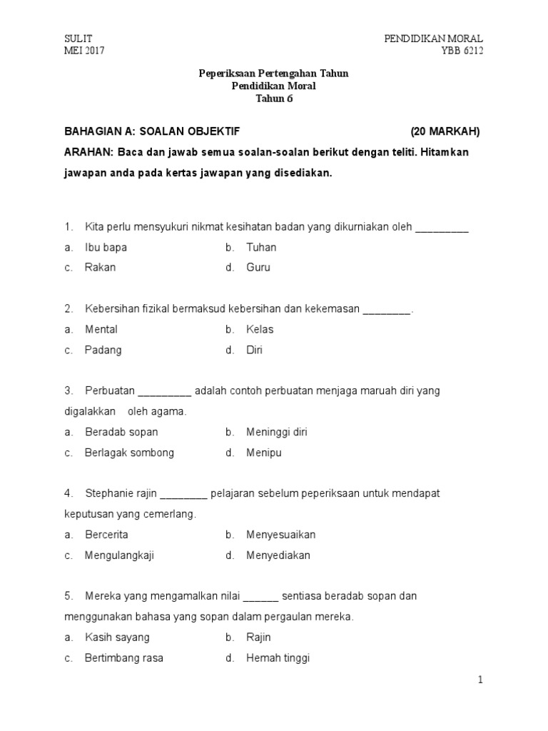 Soalan Ujian Bulanan 1 Pendidikan Moral Tahun 6 Pdf